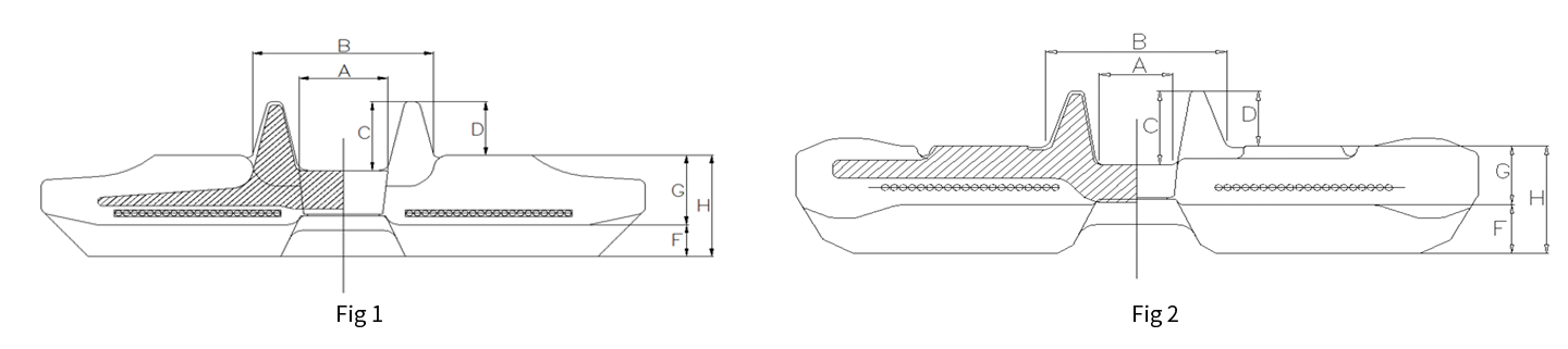 履带规格 (宽度×节距) Track Size (WidthxPitch) | 内轨宽度 lnner Guide Width(A) | 外轨宽度 Outer Guide Width(B) | 齿内高度 lnner Height (C) | 齿外高度 Outer Height (D) | 履带厚度 Track Thickness (H) | 花纹类型 Lug Pattern | 截面图 Section View | 支撑类型 Guide Type | 节数范围 Range of Link No. | 备注 Remarks |